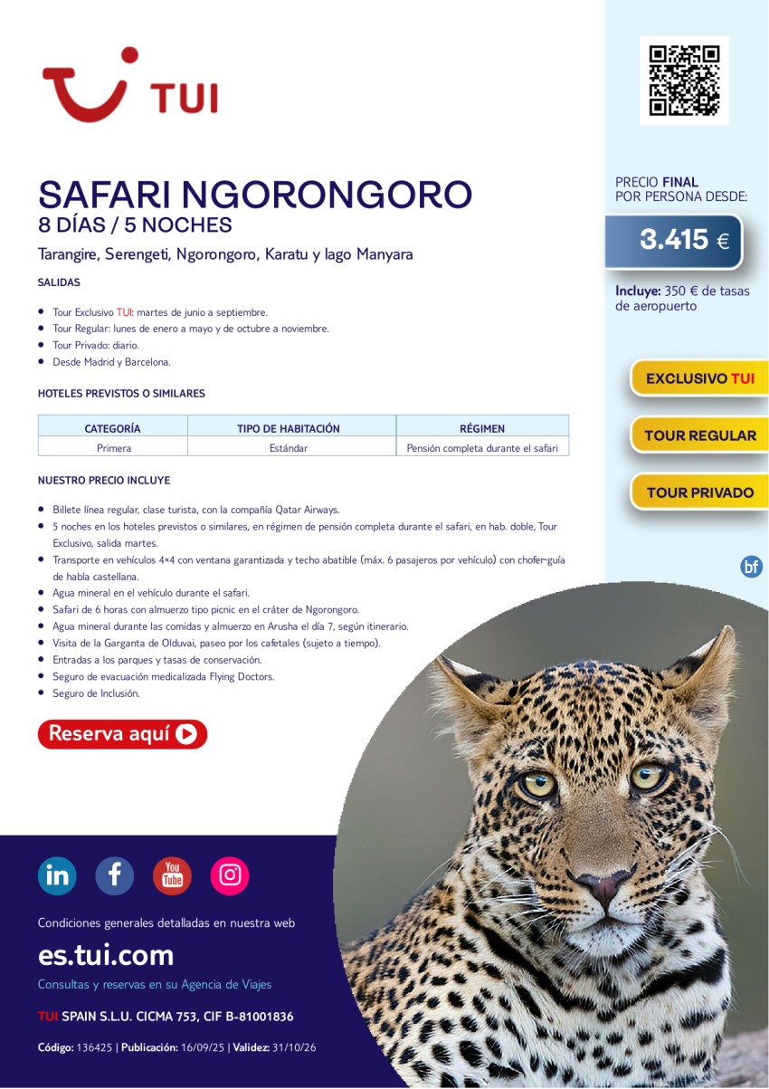 Safari Ngorongoro. 8 días / 5 noches. Exclusivo TUI. Desde MAD y BCN desde 3.415 €