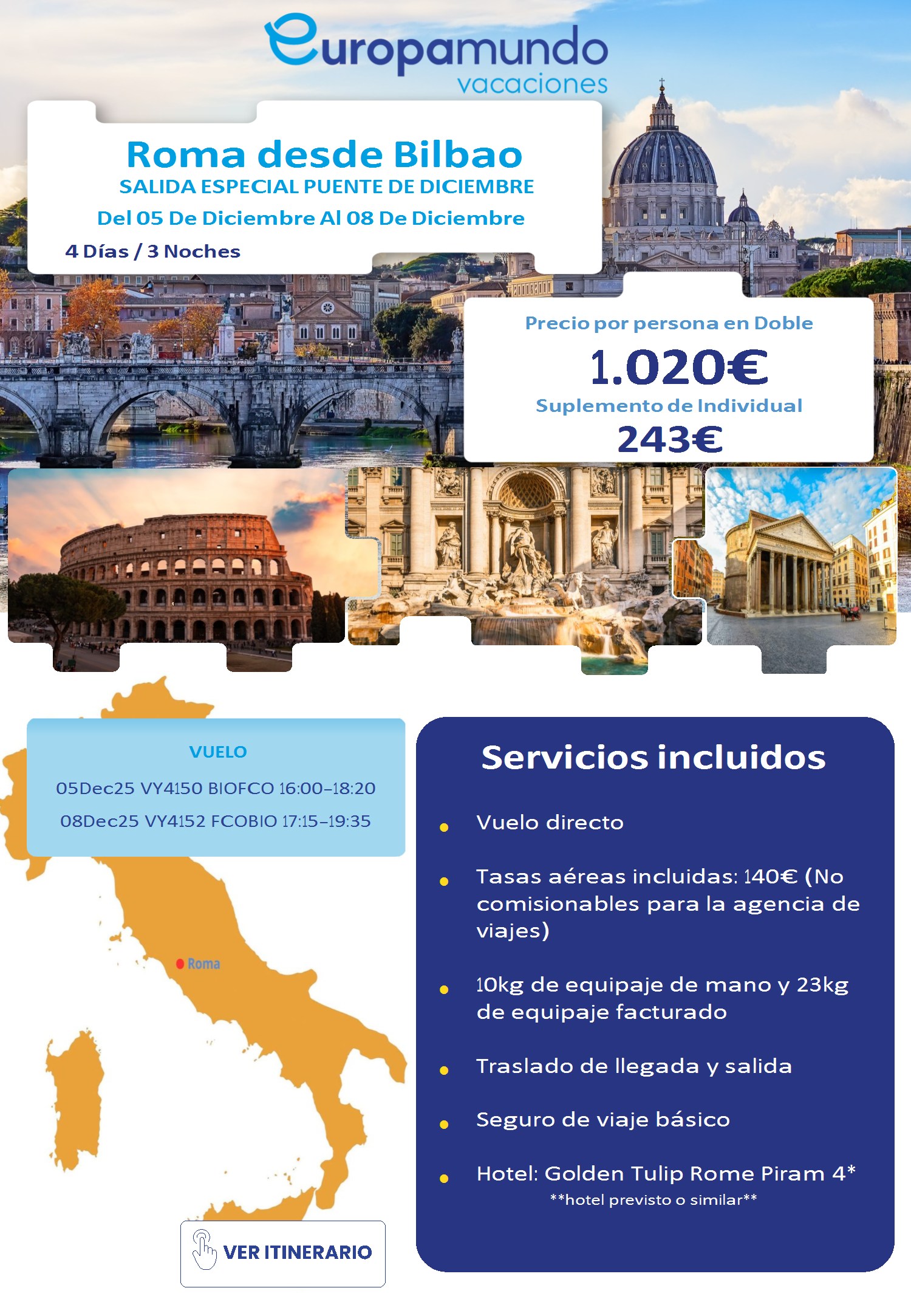 Salida Chárter Puente de Diciembre. Roma desde Bilbao
